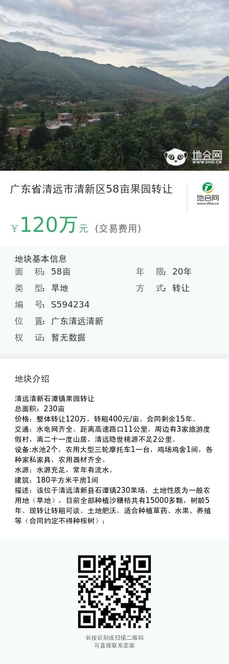 描述:该位于清远清新县石谭镇230果场,土地性质为一般农用地(旱地),目前全部种植沙糖桔共有15000多颗,树龄5年。现转让转租可谈。土地肥沃,适合种植草药、水果、养殖等(合同约定不得种桉树);